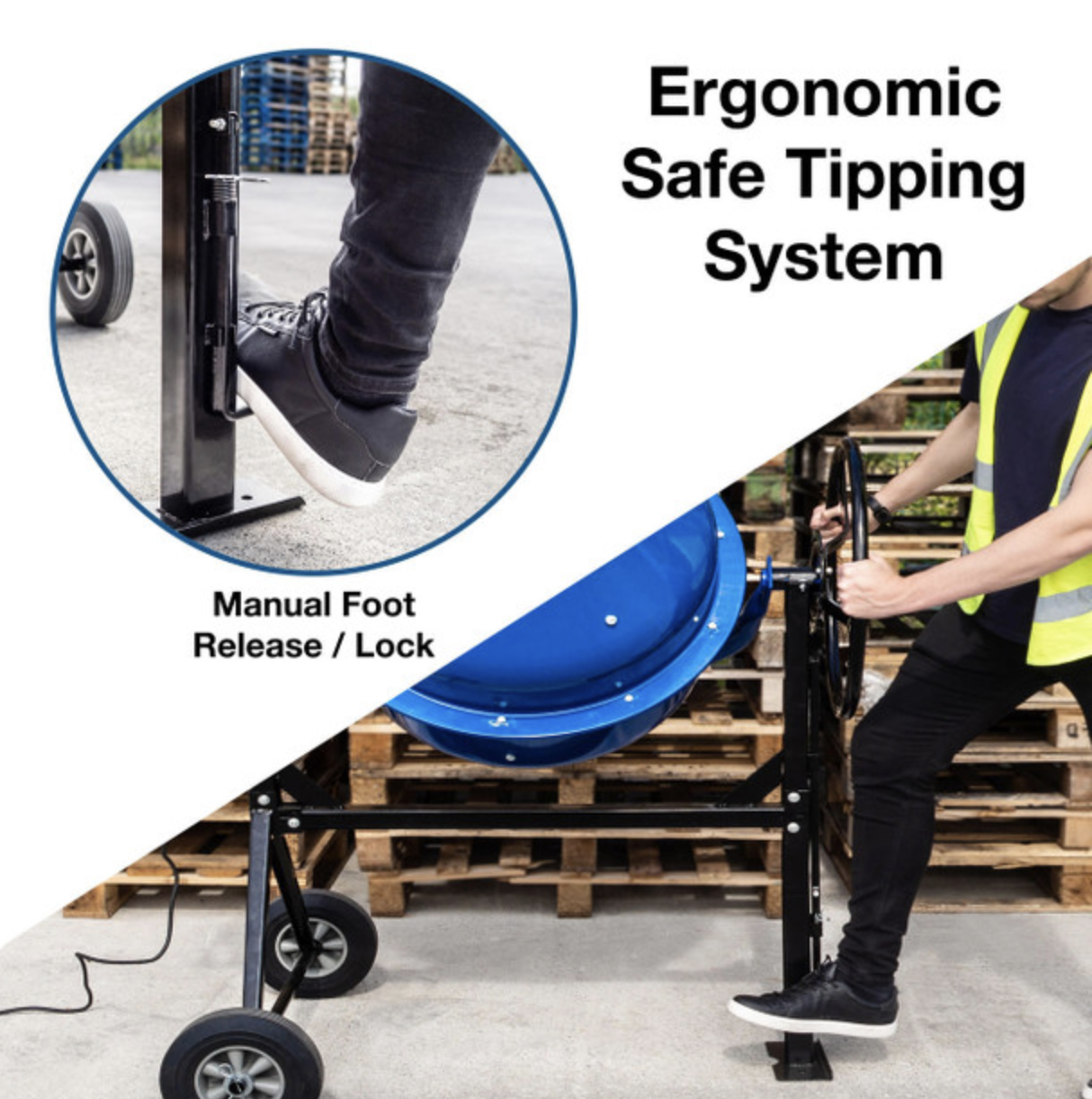 The HYCM160E concrete mixer has been designed to operate at wheelbarrow working height and the large, ergonomic handwheel requires minimal effort to tilt the drum and is locked in place by a manual locking system for safety.