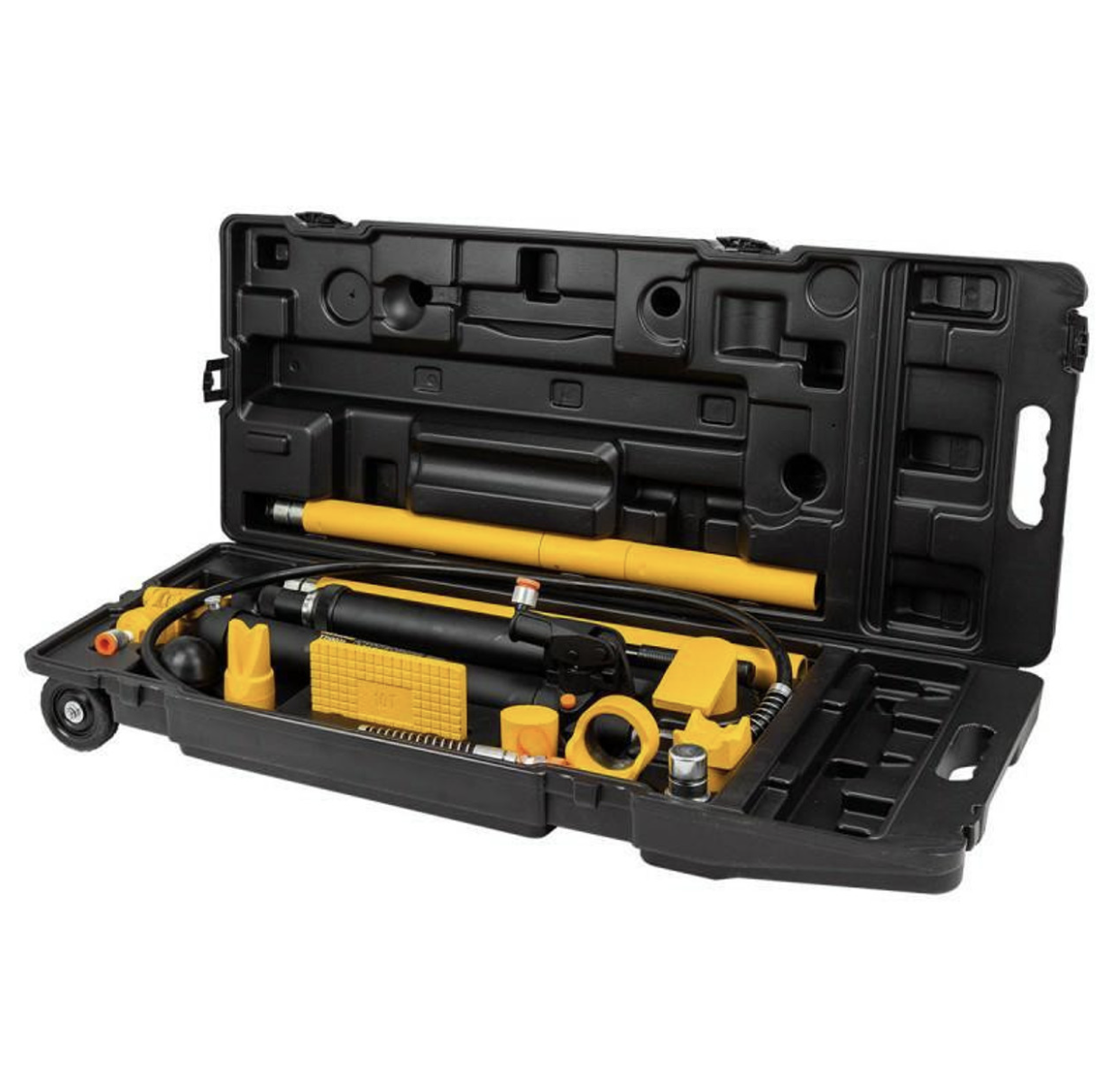 The JCB 10 Tonne Portable Hydraulic Jack Auto Body Repair Kit , JCB-T71002L – is a complete solution for automobile bodywork, frame repair, and component handling. This versatile kit is a must-have for garages and workshops, providing a robust and comprehensive set of tools for various repair tasks of cars, SUV’s and other vehicles of up to 10 Tonnes.
