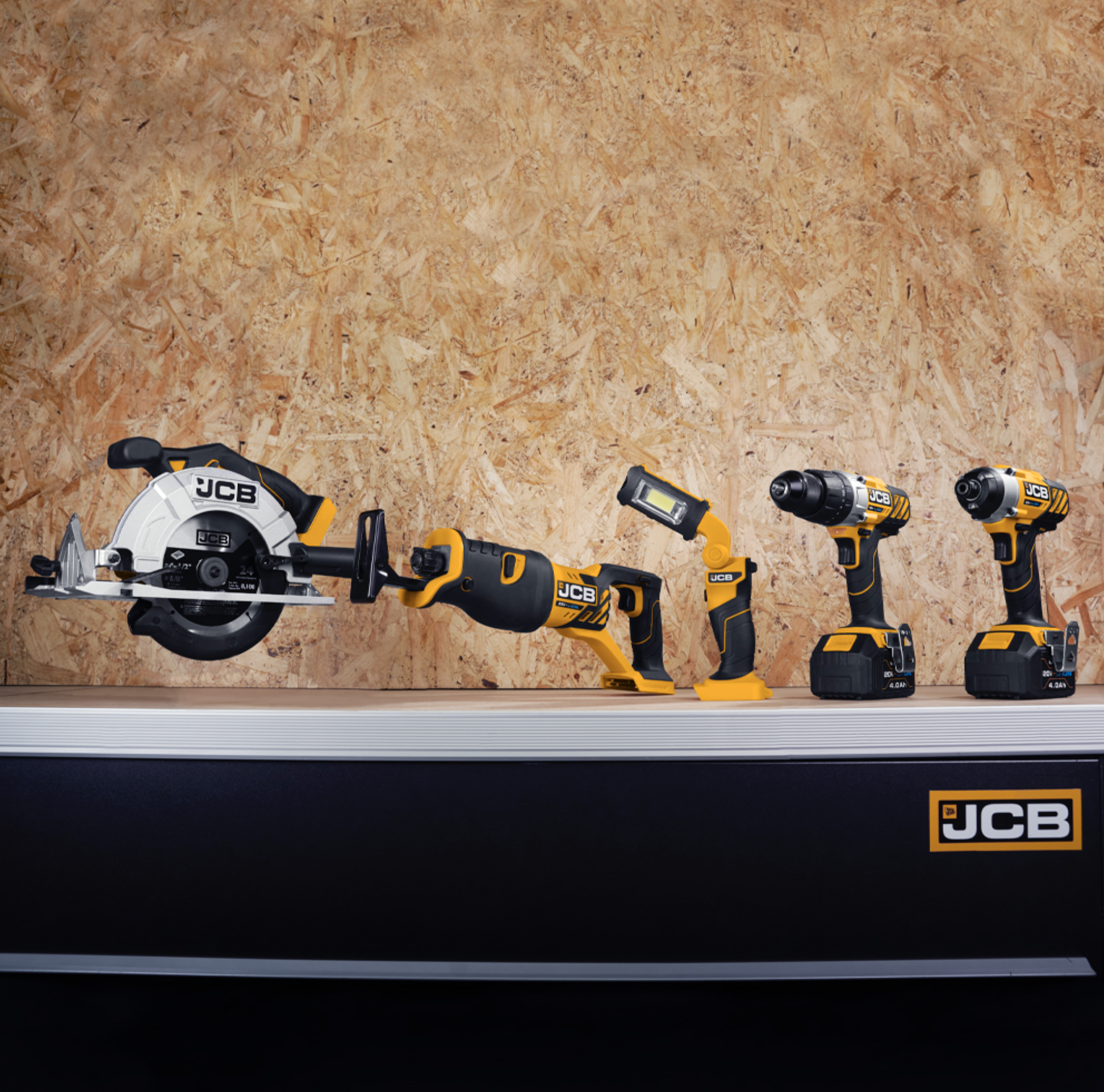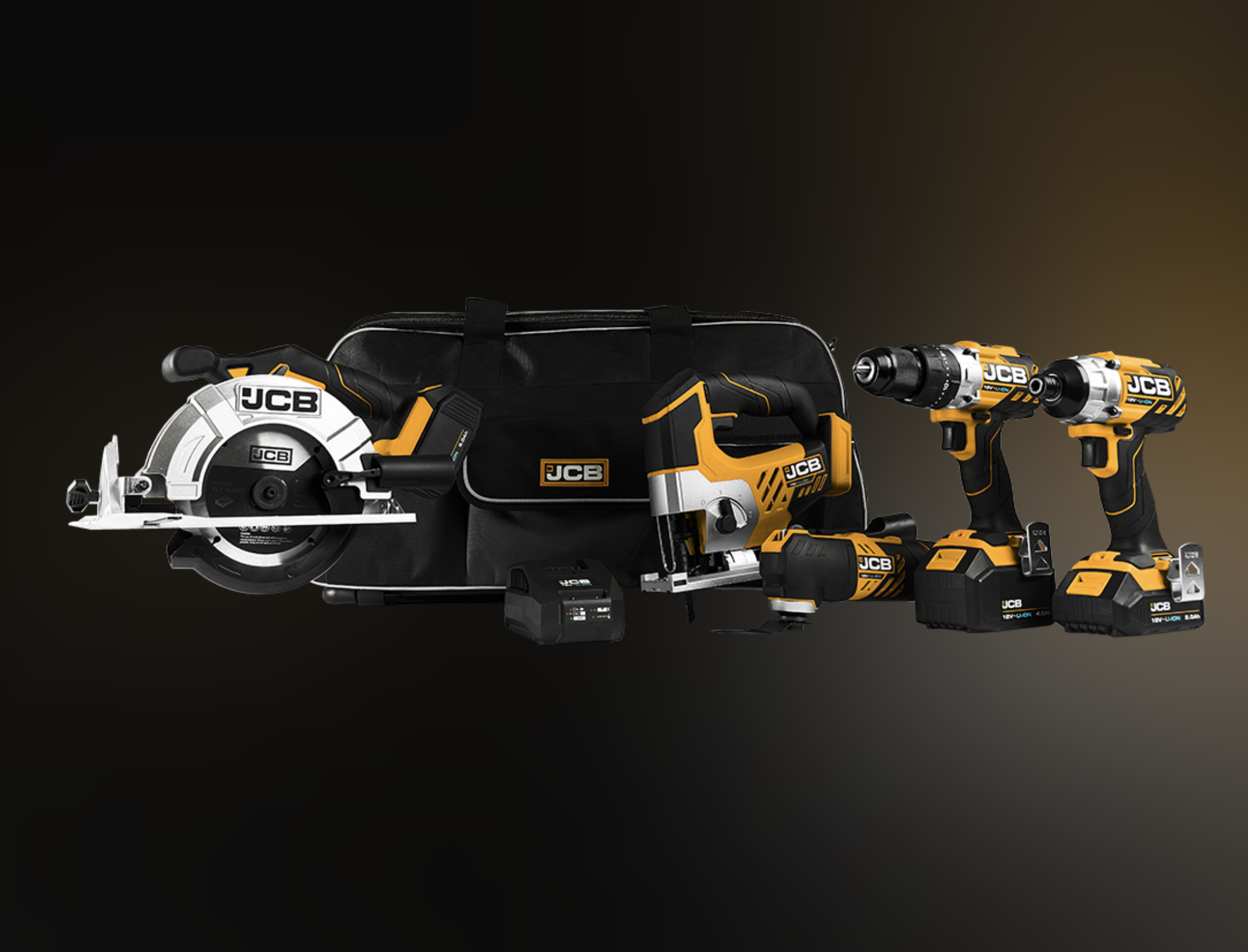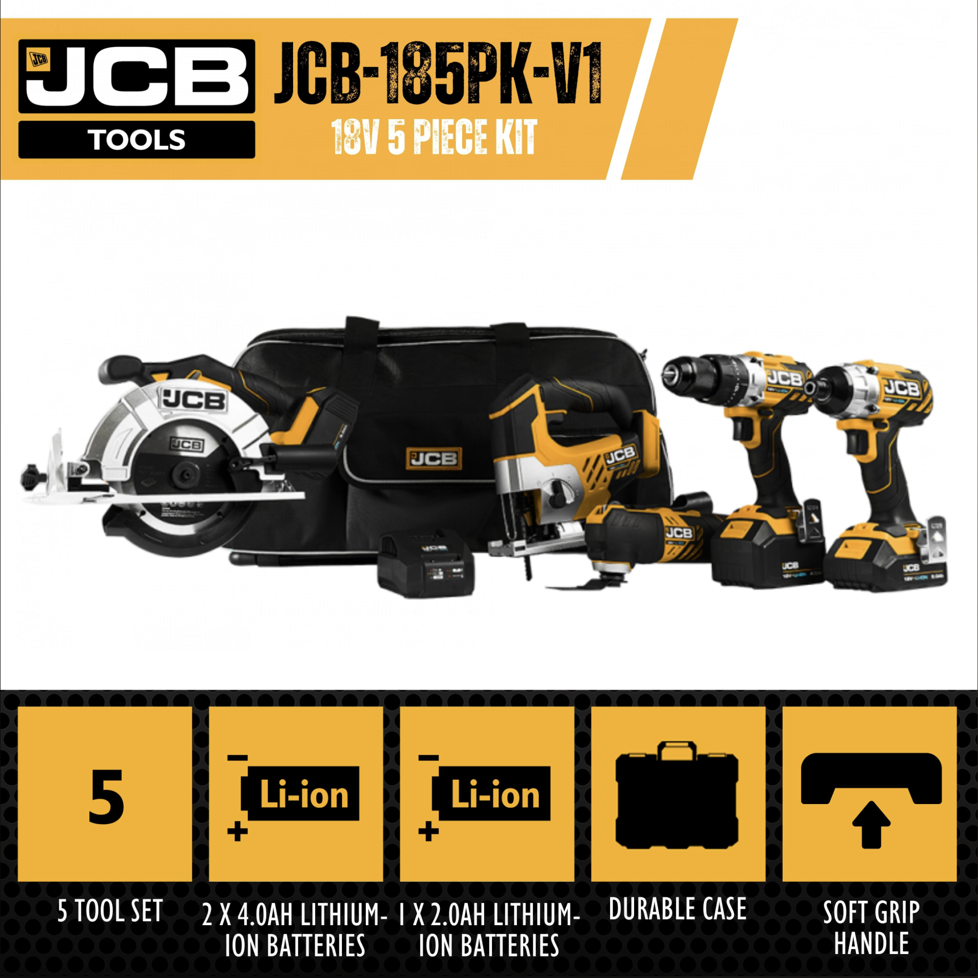 JCB 18V Cordless Power Tool Kit, Combi Drill, Impact Driver, Multi-tool, Jigsaw, 2 x 4.0Ah, 1x 2.0Ah Batteries, Charger & Bag | JCB-185PK-V1